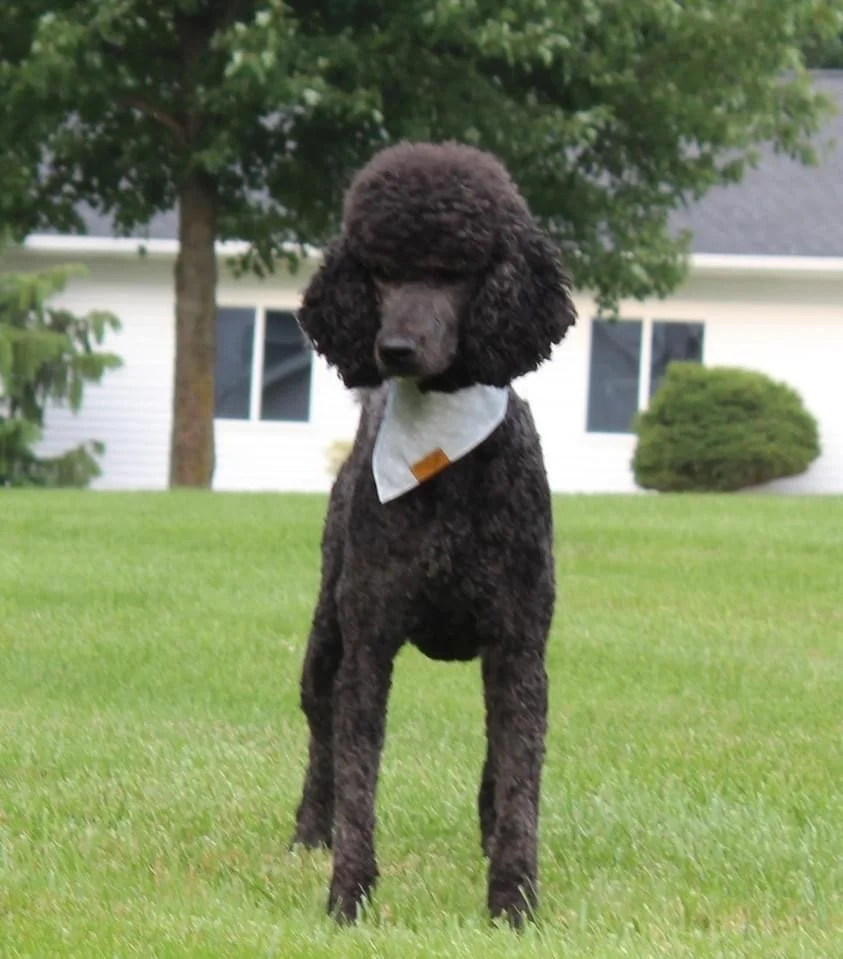 Phoebe was born and raised here on our 11 acres by us and our 2 children. She is extremely spoiled and loved on by all of us. Phoebe loves attention and is at our sides every chance she gets. Our son and daughter taught her to jump on their shoulders with her 2 front paws at a young age. now everyone that comes receives a gigantic bear hug from her. (We are trying to teach her to not jump on people but old habits are hard to break 😳). Her mamma Heather was a cream colored standard poodle and her pappa Zeke a tricolor standard poodle. Our dogs are never kenneled except when they have a litter of puppies they have an outdoor nursery to raise their little ones. During the winter it is heated and in the summer they have an abundance of shade trees to relax under. They also sleep in the nursery at nighttime. Our dogs are free to roam our property. We have an underground fence so they don’t go on the road and places where they’re not supposed to be 🥰 they spend lots of time inside with us as well.