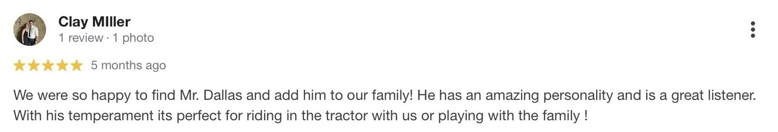 We received our sweet pup Ramsey from this breeder and cannot be happier. Neva was wonderful to work with and was very flexible with our schedule. Our puppy Ramsey is literally the best dog we know. First, he is super handsome and we always get compliments on his look. Secondly, he has such a wonderful temperament (probably gets the gene from his mama, who was such a sweet little lady when we came to see the puppies). Ramsey is great with our kids and other dogs. Training was easy, although just like with any dog, patience is key. Ramsey makes our family complete!! I highly recommend this family for your next pup!