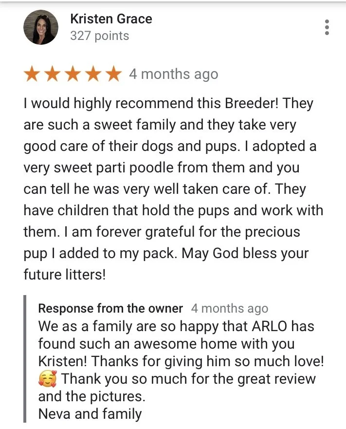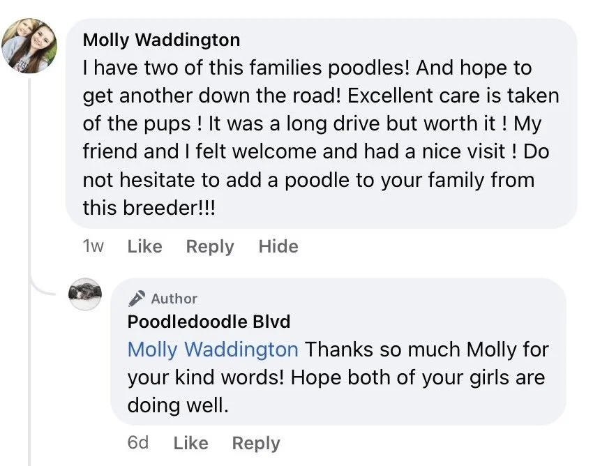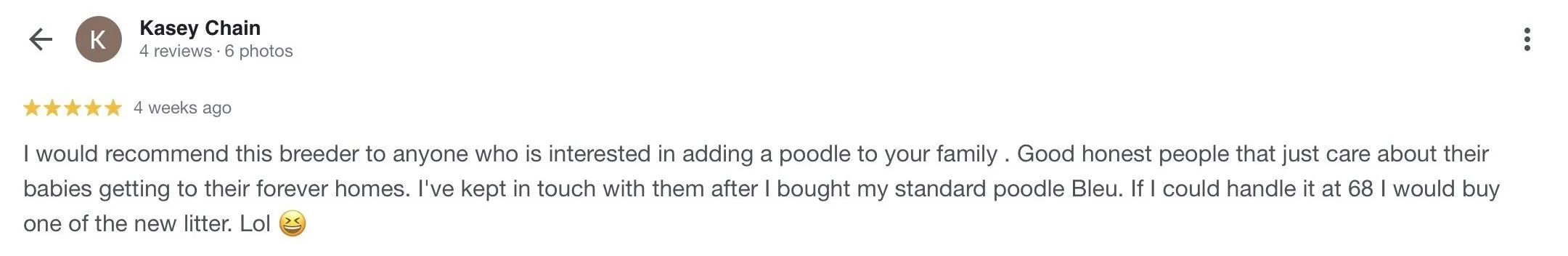 Leave your review here: I cannot say enough good things about this family and their dogs. The puppies are loved and socialized as you can see when you visit. You get to meet the owners, their children, and the adult poodles who all come to greet you! We bought Dash and "Huggles" renamed Augustus Hugglesworth. They are perfect! I would 100% recommend poodledoodle boulevard if you want a beautiful standard poodle.