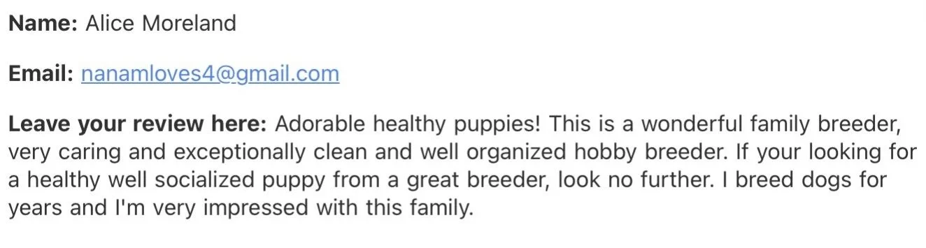 From Molly waddington (New York) Kona from nova and Maverick litter and Bella from Heather and Zeke litter… august 2022………..Such a great family to work with! The owner kept in contact with me and even sent me pictures and a video to help the wait to get our beautiful go faster! The puppies when we got there we in an out door area and had plenty of toys and activities. It was obvious that the pups had lots of attention as they were friendly and confident. Thier adult dogs roamed the property and made no fuss about us being there. I was so thrilled with my pup and ended up leaving with my Ethel and a pup from another litter little Adaline! We still keep in touch and I wouldn’t hesitate buying a pup from her our experience was brilliant!